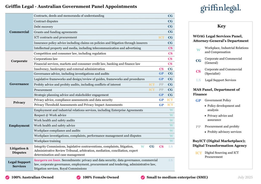 Griffin Legal has extensive capability in advising Government with a passion for providing high quality legal services to both Commonwealth Government and State/Territory Governments.